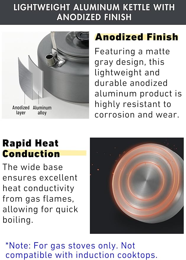 - This 1.0 Liter hard-anodized aluminum camping tea kettle is only 6.4oz weight, which is lightweight and compact for camping, backpacking.