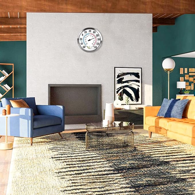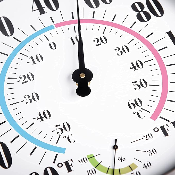 - Large Outdoor Thermometer Decorative: 12 inch diameter round wall thermometer hygrometer accurately measures temperatures from -60 to 140 degrees Fahrenheit (-50 to 60 degrees Celsius) and relative humidity levels from 20 to 90% with the dial's bold black pointers, the round outdoor thermometer accommodates all general temperature and humidity changes