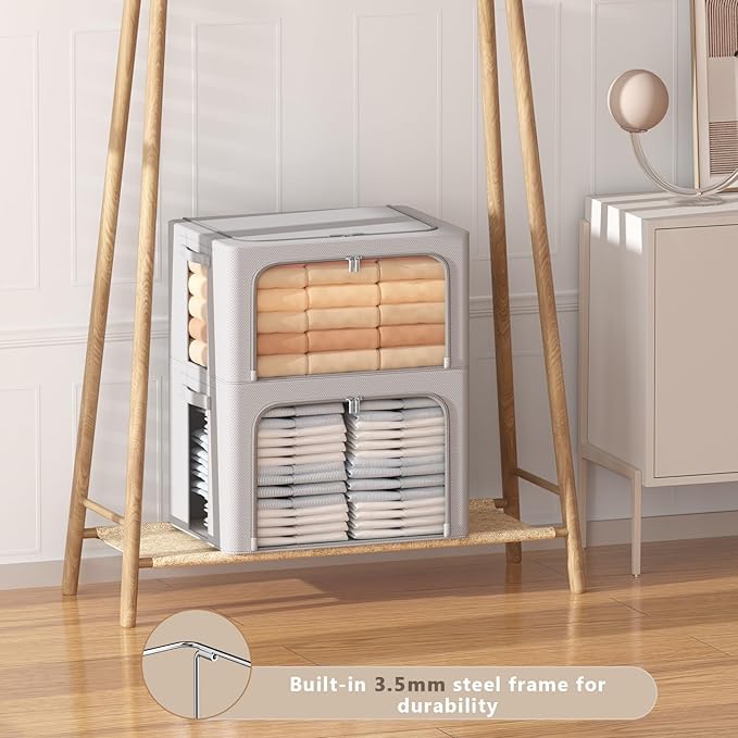 3Pack Frame Storage Box - Clothes Storage Bin Bags Oxford Fabric Foldable Stackable Container Organizer Set with Clear Window & Carry Handles Large Capacity (Grey, Small-22L)