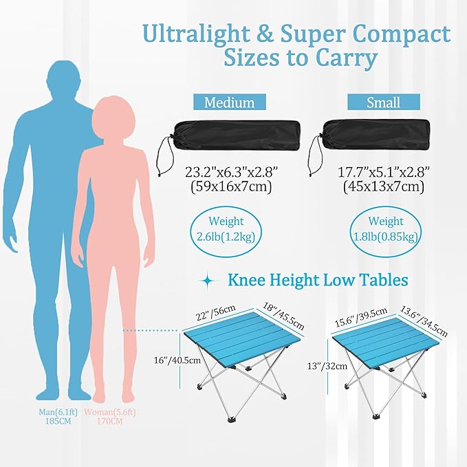 - Ultra lightweight and easy to carry - Our folding camping table has an aluminum tabletop and frame, so it is lighter than another wooden camping table of the same size, with a weight (Small: 1.85 pounds / Medium: 2.6 pounds / Large: 3.3 pounds) that is lightweight enough to carry. It can be folded into the accompanying handbag, placed in a backpack, or placed anywhere needed. The small camping table provides a stable working platform for amateur enthusiasts. This portable camping table is the perfect companion for portable camping chairs or folding stools. You can even use it as a folding beach table, or a tent table sitting on a beach mat or camping mat.