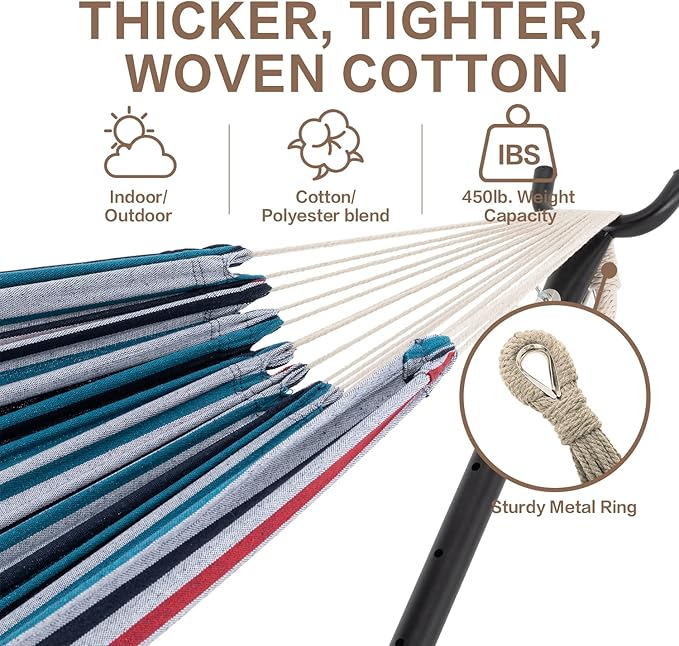 - DOUBLE HAMMOCK , It has the stronger and durable steel stand, a hook with a metal buckle. 450-pound weight capacity easily accommodates up to two people at once