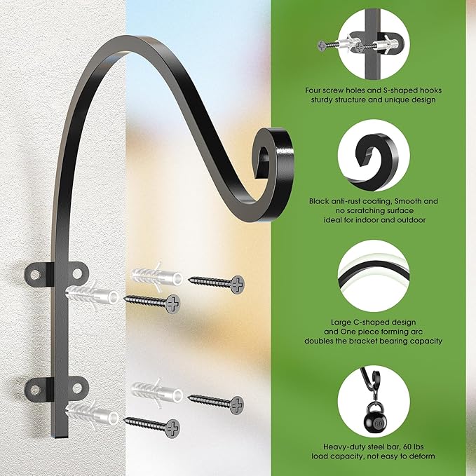 - SOLID AND STURDY STRUCTURE: Curved up iron hanger hooks with four-hole mounting structure provides extra support and strength with max load capacity up to 60lbs, which can be securely fastened to provide the safest protection for your plants and other objects.