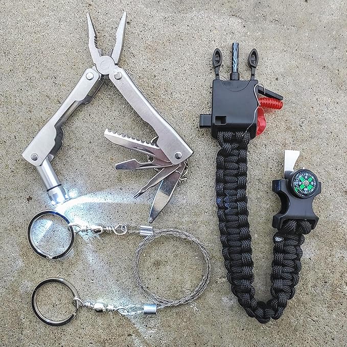 - TACTICAL EMERGENCY SUPPLIES: An emergency blanket, rain poncho, multitool with LED light, wire saw, duct tape, and survival bracelet with flint and compass are crucial in the wilderness (hiking, camping, hunting, or fishing) and on the water.