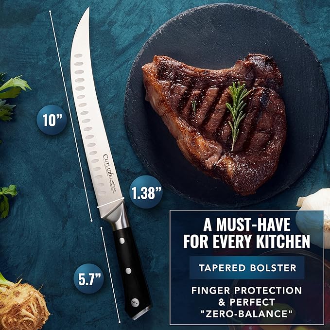 - PREMIUM PERFORMANCE – Perfectly engineered carving butcher knife tapered to a razor-sharp edge for effortless breaking down, trimming, cutting and skinning of meat.