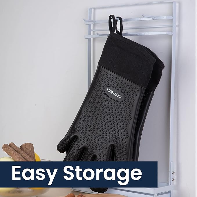 - Effortless Cleanup, Smarter Kitchen Flow: Waterproof silicone repels hot grease and marinade spills, while dishwasher-safe design erases stains in minutes; Hang the oven gloves compactly with the built-in loop—ideal for small kitchen spaces or tossing into camping gear without bulk