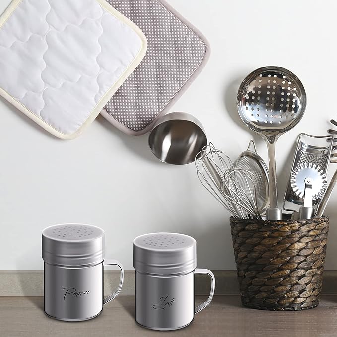 2-pack 13.5oz Stainless Steel Salt and Pepper Shakers with Lid and Handle Seasoning Dredge Shaker for Cooking Kitchen Baking Salt Candy