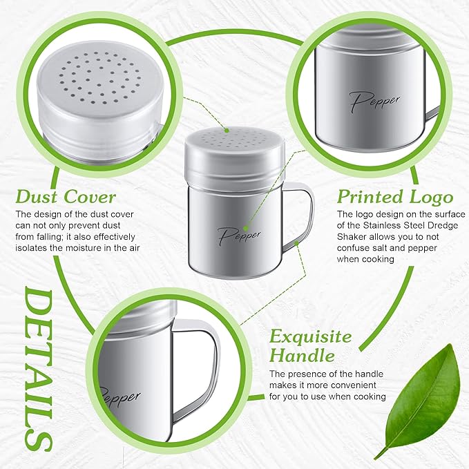 - Multiple usages: it is available for you to use our stainless steel dredge shaker to hold various things, such as salts, peppers, candies, and so on; It is also suitable for you to place it in your kitchen, restaurant, dining rooms, and so on, so it is convenient for you to use it at most of time