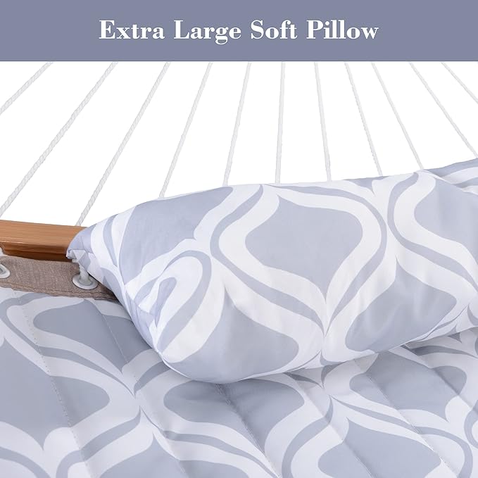 - Comfortable and Non-fading: Two-layer 100% quilted polyester fabric with poly fiber filling, cozier and best for camping and the outdoors. Compared with other quilted hammocks, it will not fade after long-term use. A polyethylene-stuffed head pillow offers superior comfort. You can even set your preferred height by hooking the suitable chain section to the hooks on the stand