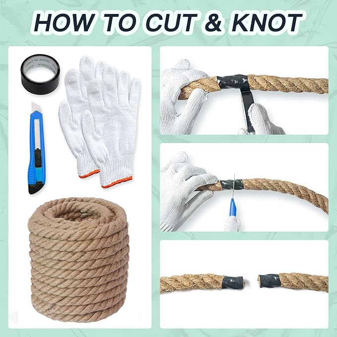 - HOW TO CUT ROPE - The package comes with work gloves which can protect your hand while using twisted rope. We suggest that using a heavy tape to wrap a small section, then cut the rope into the specified length.