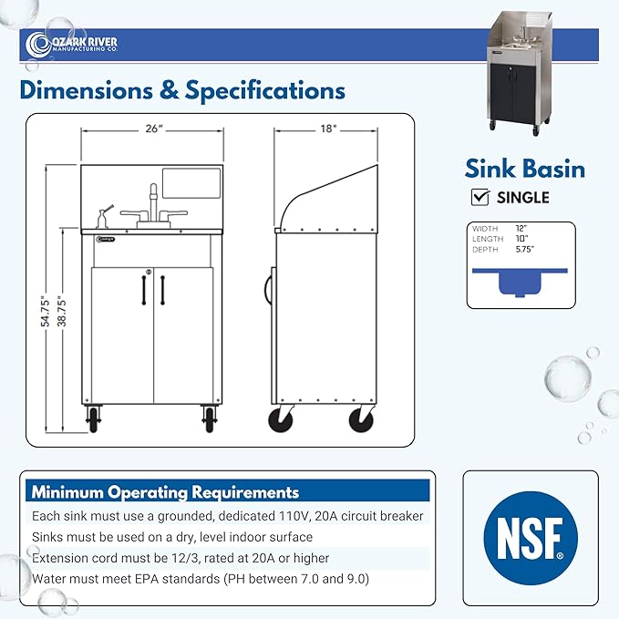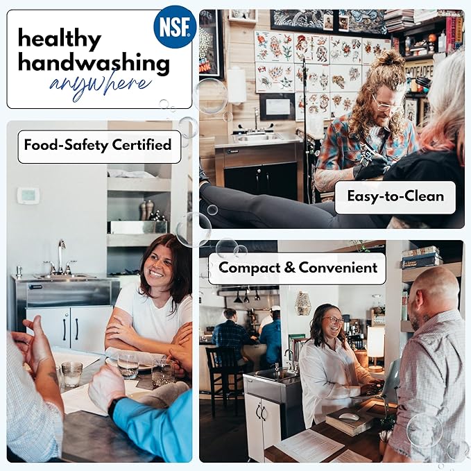 - NSF-Certified – Stay handwashing code-compliant with this NSF-certified, no-plumbing portable sink with hot water that’s built specifically for commercial, utility, restaurant, and food truck use. Simply plug in this self contained sink and say goodbye to code compliance questions and costs
