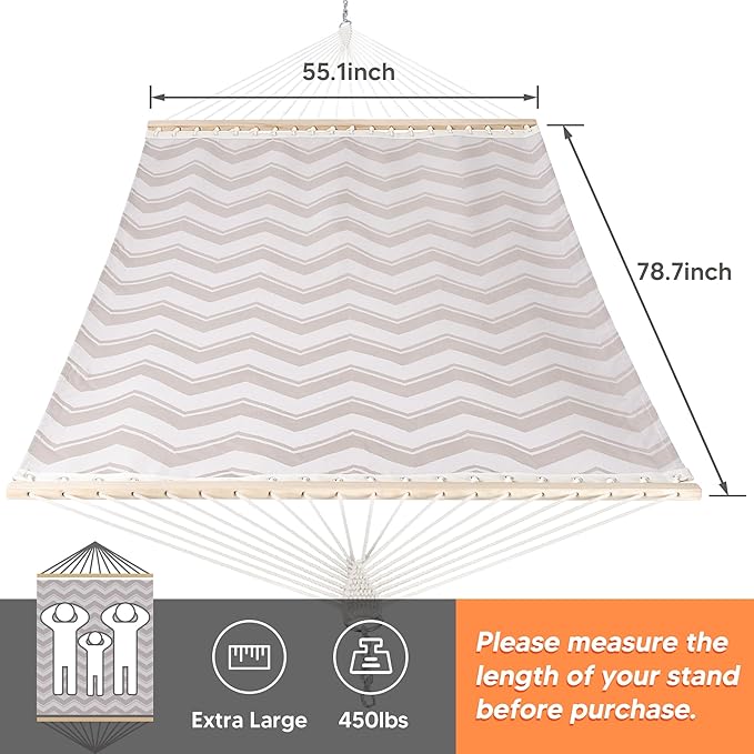 - Easy to Use: Features 18 inch chains and tree hooks, this two person hammock can be hung indoor or outdoor. Itβs perfect for bedroom, poolside, garden, patio, backyard, balcony, and many else. You can search ASIN B09D7PTPH1 for 12 ft stand. Feel free to contact us if you have any questions during use within one year of purchase. We are always here to help