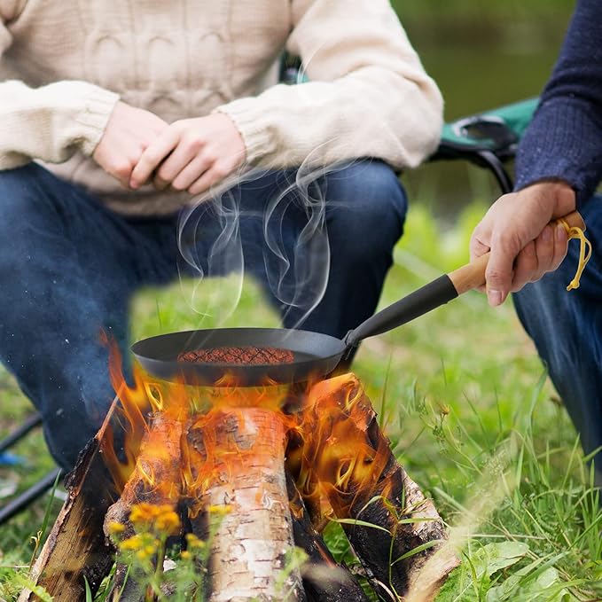 - 【Space Saving】 The grill pan is 8.2 inches, the wooden handle is foldable for easy storage, and it comes with a lanyard, which can also be hung to save space. Suitable for camping and outdoor cooking