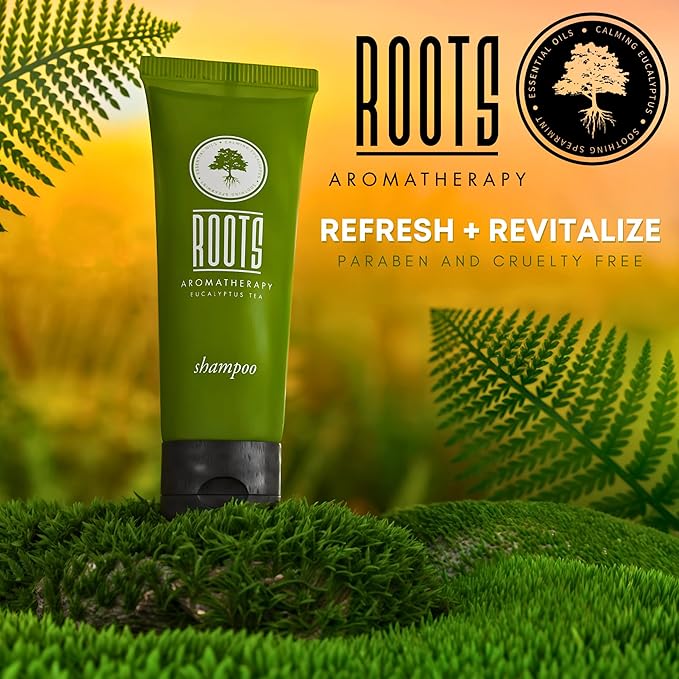 - šæ REFRESHING & ENERGIZING: Immerse yourself in the invigorating blend of Australian Eucalyptus and rejuvenating tea fragrance. This travel size shampoo and conditioner set, part of our Roots Aromatherapy Eucalyptus Tea Hotel Soaps and Toiletries Bulk Set, harnesses the power of nature to rejuvenate your senses, leaving you refreshed and revitalized after every use.
