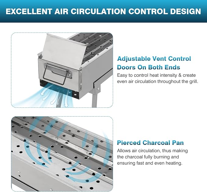 - 【Excellent Exhaust Design】 This grill outdoor cooking is featured with a flexible vent-control door on two ends, easy to control heat intensity, create even air circulation throughout the grill and make the charcoal inside fully burned.