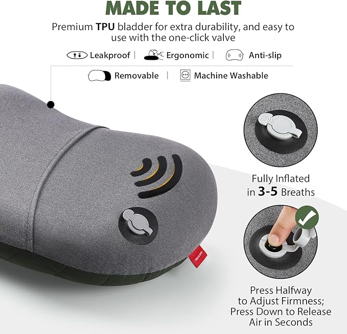 - šššš ššš šššš šššššššššš: Unlike those traditional integrated air pillows which can easily develop a leak and become useless, our camping pillow for backpacking consists of a machine washable foam pillowcase and a removable air bladder which is made of premium thickened TPU to prevent air leaks effectively. Assure you a clean and luxurious night sleep outdoors.