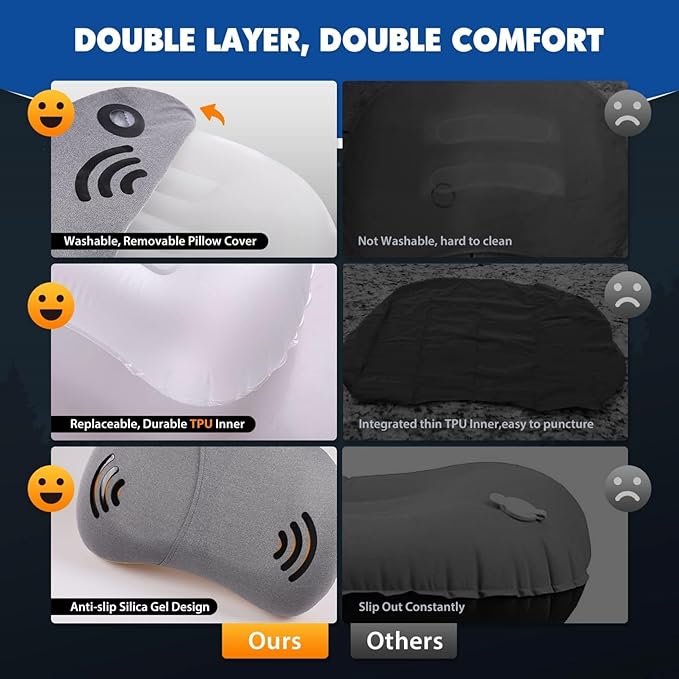 - šššš ššš šššš šššššššššš: Unlike those traditional integrated air pillows which can easily develop a leak and become useless, our camping pillow for backpacking consists of a machine washable foam pillowcase and a removable air bladder which is made of premium thickened TPU to prevent air leaks effectively. Assure you a clean and luxurious night sleep outdoors