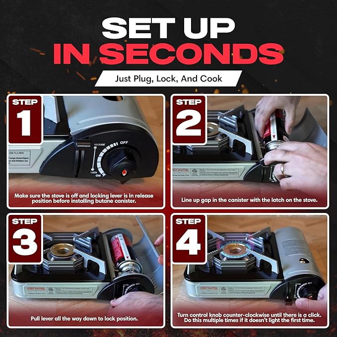 - SIMPLE IGNITION & SAFE, USER-FRIENDLY OPERATION – Light your camp stove with ease using the intuitive ignition system—just attach your fuel, turn the knob counterclockwise past the resistance point, and listen for the click to ignite. If needed, continue turning until the flame starts. Built for safe and straightforward use, this stove is ideal for outdoor cooking in campsites, hiking trails, tailgates, and emergency situations. Ensure proper ventilation, follow safety precautions, and keep flammable materials at a safe distance.