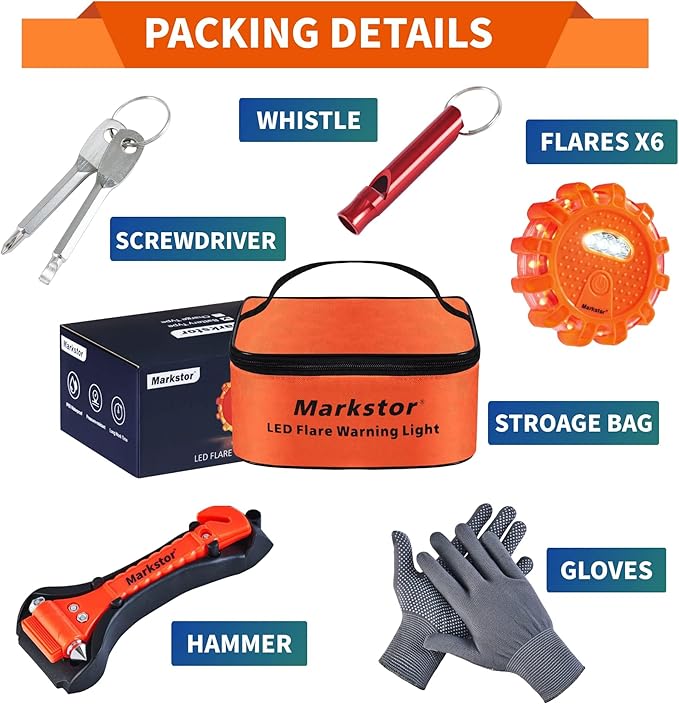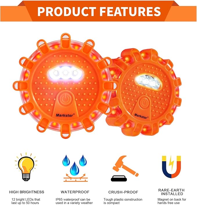 - Shockproof & Durable - Markstor high-tech led road safety flares is super duty; It has a shatterproof lens, even being run over by a truck won't do it any damage! Unlike the traditional flares , Markstor road flare lights does not need to be lit, and it is safer and more reliable!