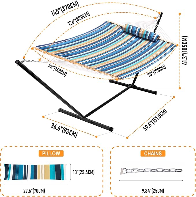 - HEAVY-DUTY HAMMOCK STAND: No damage to trees. This 12 ft double hammock stand is made of powder coated heavy-duty steel for durability and stability. It can be assembled in minutes without any tools, and can be easily disassembled, making it a portable hammock