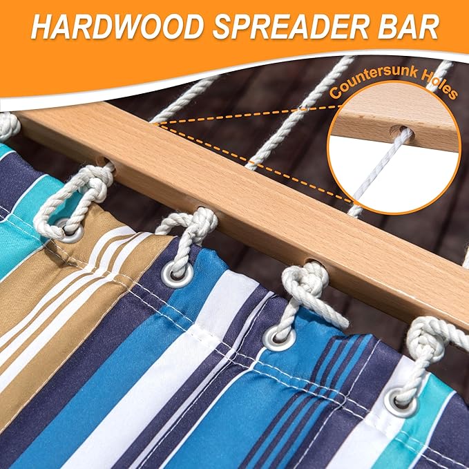 - STRONG HARDWOOD SPREADER BAR: This hammock has 2 pieces of 55-inch strong hardwood booms on both sides with an oil rubbed finish that is stylish and weather resistant. Each hardwood boom has 18 holes to minimize friction between the rope and boom