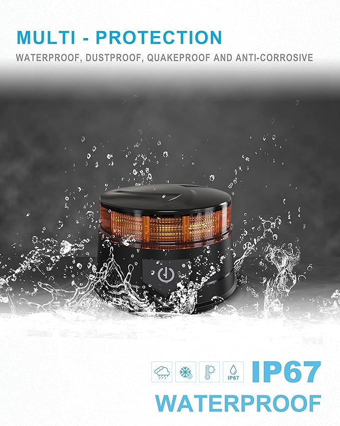 - 【HIGH QUALITY】Beacon LED amber lights are made of durable ABS material and crystal-clear PC mask; outputs maximum brightness; compliant with EMC R10, ECE R65, SAE J845 certification; durable for 50,000 hours with an IP67 waterproof rating; ensure full charge with 12 or 24V input voltage before use