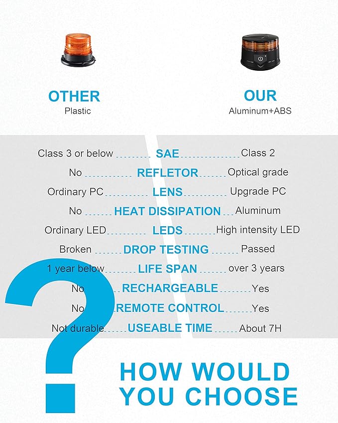 - 【RECHARGEABLE AND MULTI-APPLICATION】Rechargeable beacon amber light includes overcharge, overdischarge, and overtemperature protection; fully charges in 4 hours for up to 6.5 hours of use; suitable for emergency vehicles, construction trucks, snow plows, shovels, tractors, golf carts, UTV vehicles, school buses, postal services, and safety alerts
