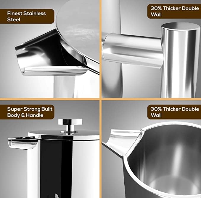 - Sleek Stainless Steel – The coffee maker is created using 304 grade stainless steel, with a smooth and durable finish and carefully designed to give you the French press you need.