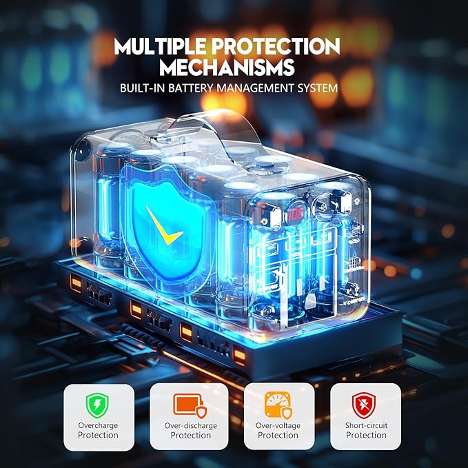 - MULTIPLE PROTECTION MECHANISMS: We never compromise on the safety of this battery bank, the built-in Battery Management System (BMS) could protect it from over-temperature, over-voltage, over-power, over-current, and short circuits no matter the weather is cold or hot, it is outdoor or indoor.