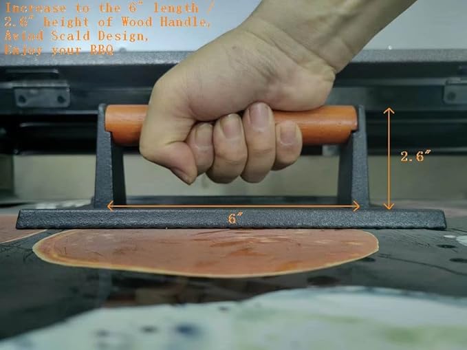 - 【LESS TIME COOKING, MORE TIME EATING】: Got people coming over, and want perfect, consistent bacon, quick? The Firsgrill signature iron grill press is 8.3-inch*4.3-inch and presses down on your favorite thin meats to make them cook faster and more evenly.