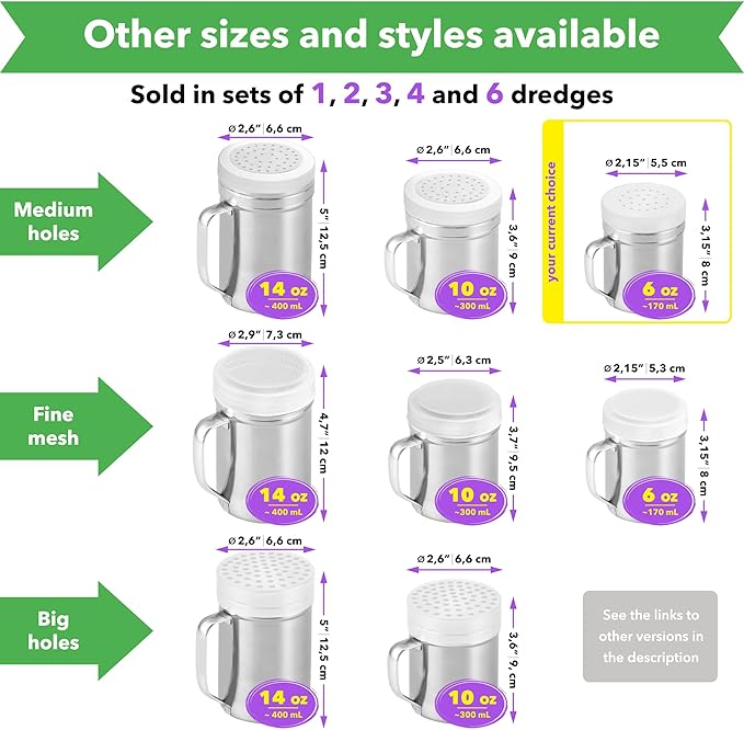 - You will receive two stainless steel cooking dredges (6 oz) with handles, metal twist-off lids, and plastic caps; style: medium