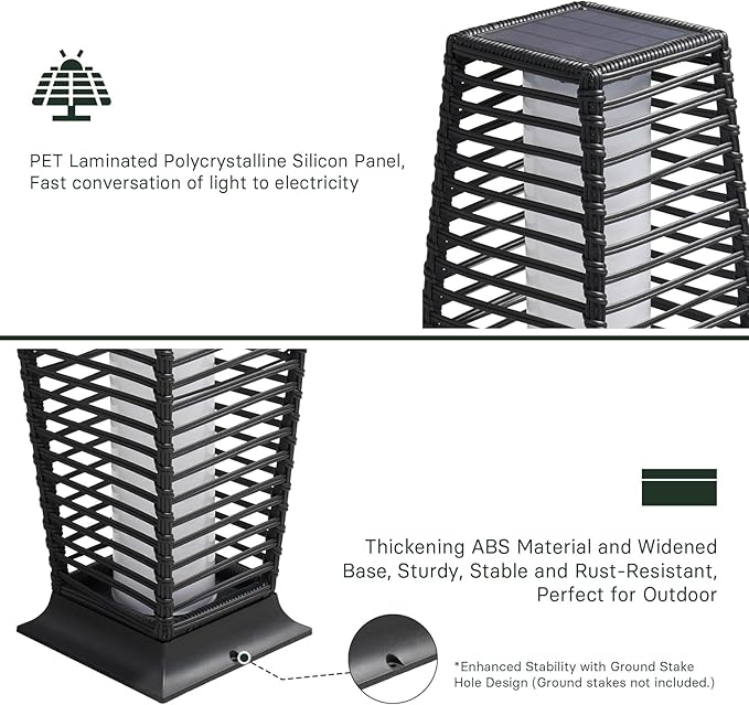 - WEATHER RESISTANT: Never worry about the harsh weather! This solar lamp is featuring an IP65 waterproof rating, resistant to rain, snow, and other conditions, which is a reliable option for your outside lighting needs
