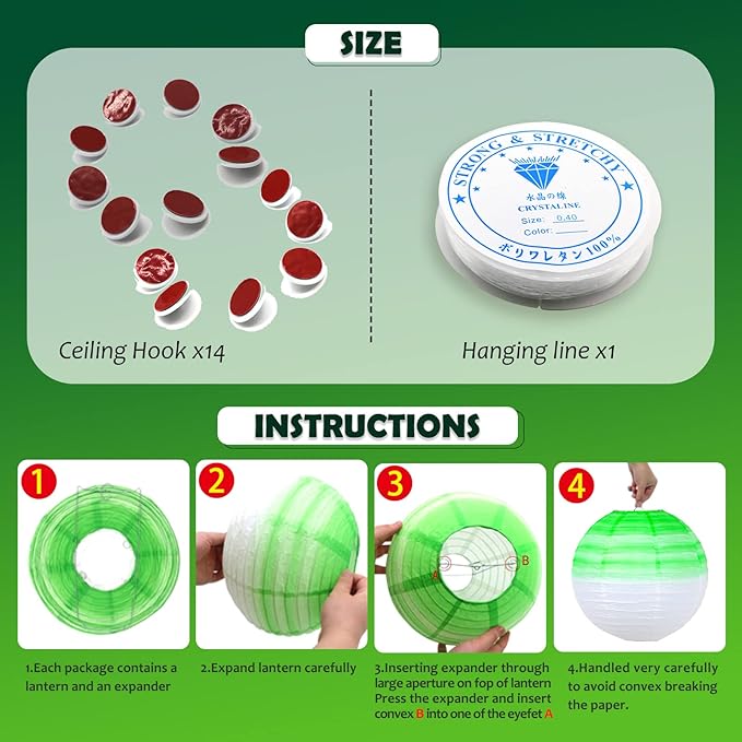 - Easy to Operate Paper Lantern Party Supplies -- Paper Lantern Set comes with 14 pieces of round hanging Lanterns to hang at your party. round paper lanterns' sizes include 10 "X3 pieces, 8" X 6 pieces and 6 "X 5 pieces. Each Paper Lantern Lamps comes with instructions. Colorful paper Lantern is easy to assemble and extremely simple to disassemble. We will provide you with a transparent line & 14 pcs ceiling hook. Each tissue paper lanterns has a hook on top of its wire that can be hung anywhere