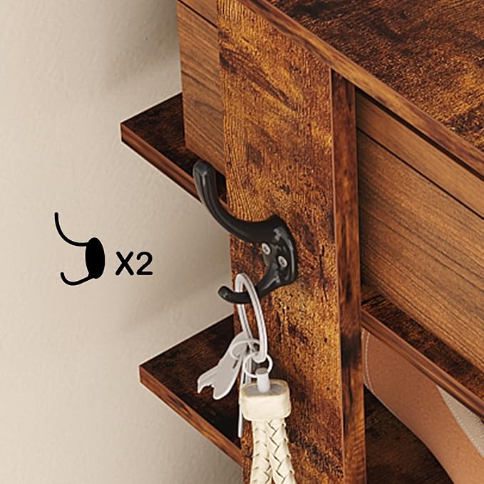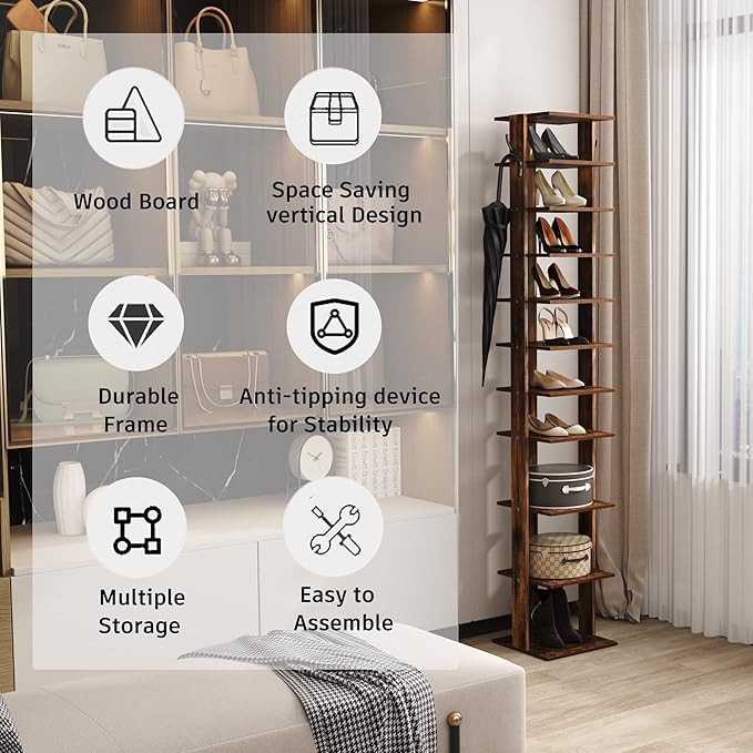HOMEFORT 10-Tier Vertical Shoe Rack, Corner Shoe Tower, Slim Shoe Organizer with Two Hanging Hooks, Wooden Shoe Storage Stand for Entryway, Hallway, Closet, Rustic Brown