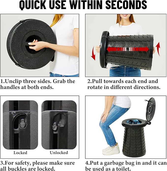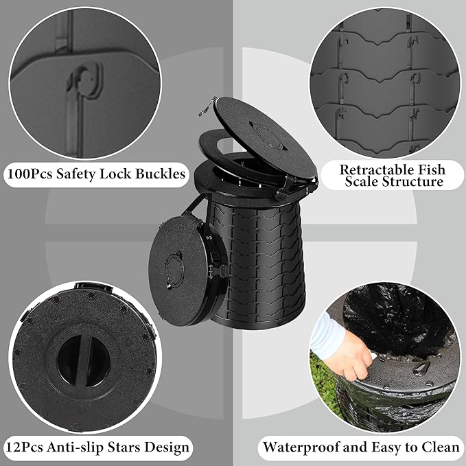 - 【MULTIFUNCTIONAL TOILET STOOL】Portable toilet series: 1.Functional Cover Design, Makes you free to switch various modes of use, as a toilet, a stool, a storage box, Trash can,Pregnant woman vomiting bucket, outdoor folding toilet, home folding storage stool. 2. Washable and Strong resistance to fall and pressure, could hold up to 880lbs