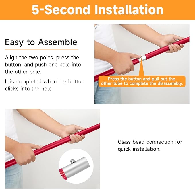 - Simple Button Lock Mechanism Simplifies Your Installation Process: Just push the 2 sections of poles into the holes by buttressing,after use,simply pull the spring to disassemble.
