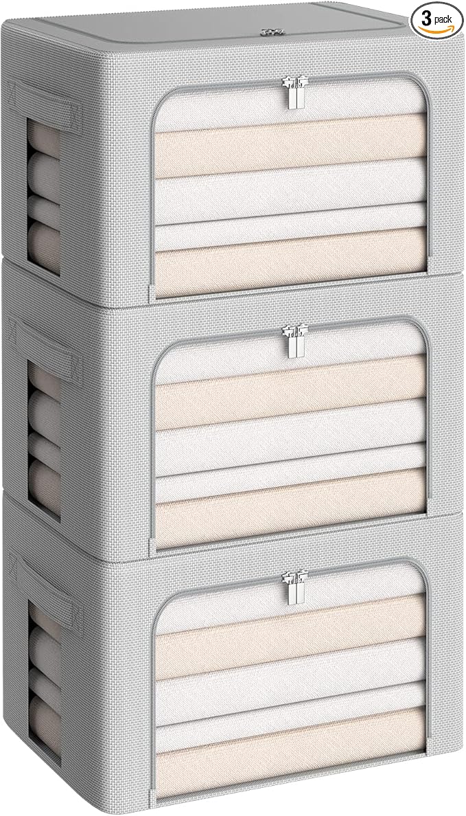 3Pack Frame Storage Box - Clothes Storage Bin Bags Oxford Fabric Foldable Stackable Container Organizer Set with Clear Window & Carry Handles (Grey, X-Small-36L)