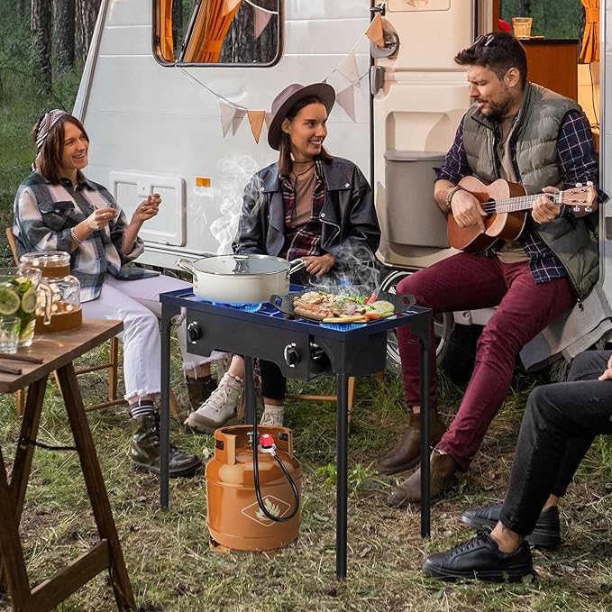 Outvita 2 Burner Propane Gas Stove for Outdoor Cooking, 150,000 BTU Camping Cooker with Removable Legs, Temperature Control Knobs for Backyard Cooking, BBQ, Baking and Frying