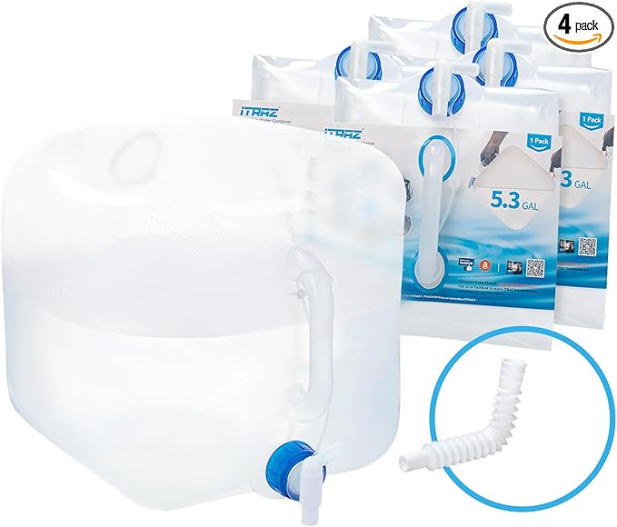 - HIGHEST-QUALITY US RAW MATERIALS: The ITRAZ collapsible water container is made from a new type of LDPE4 and PP, which are environmentally friendly, food-grade, non-toxic, odorless, and free from BPA, PVC, and DHEP. This makes it safe for storing drinking water. It is more transparent, flexible, and softer than other brands on the market. Additionally, it is less likely to crack or become damaged and is durable enough for heavy-duty use.