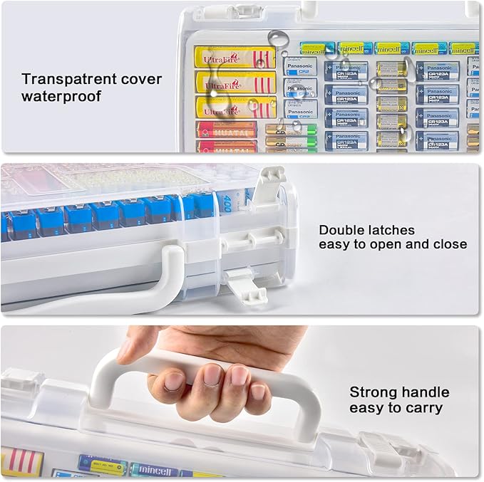 - Battery case with double latches and sturdy handle: The battery holder case's latch is easy to open and close, with a thumb-sized notch in the latch position, allowing you to open the battery C D holders storage case without pain in your hand. The 180-degree flip handle even with full battery, the handle is stable as before. Batteries variety pack groove design at the handle makes it easy to lift the battery holder and to carry out at any time, ensuring safe storage or transportation.