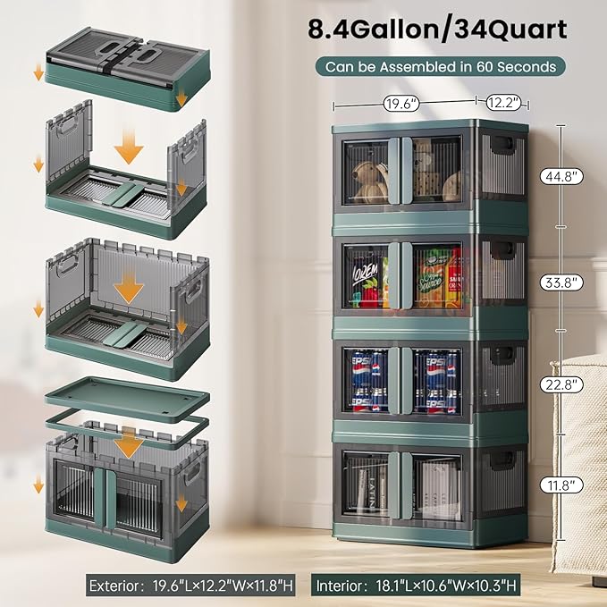 8.4Gal Collapsible Storage Bins with Lids & Wheels - 3 Pack Stackable with Doors, Heavy-Duty Plastic Containers for Home/Office, Green