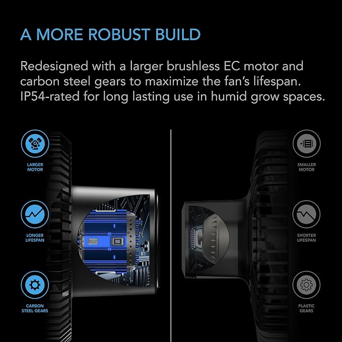 - A 9-inch clip-on fan engineered for longer-lasting, tailored circulation in grow space environments.