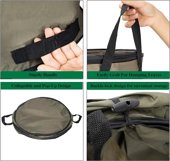 - 【Collapsible and Pop-Up Design】 Collapsible lawn and leaf waste bag collapses quickly and easily for compact storage when not in use and expands quickly and easily when needed. Pop-Up Trash Can has 2 carrying handles on top for easy carrying and dumping. 2 strong tough handles that allows you easily grab for dumping leaves. Flexible and hard spiral spring spine, which can be automatically ejected, and it can also be folded for quick and easy storage, Does not take up space.