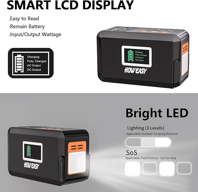 - Smart Displays and LED Lights:Mutifuction LCD display would show you the remaining energies/charge/discharge/AC output/DC output status.Ultra-bright LCD screen allows you to know the status of the battery pack even when camping without a light source。 2)This portable charger power bank comes equipped with a 3-level brightness and SOS mode,Simply press the LED flashlight switch to adjust the brightness and activate the SOS mode,Whether you're camping in the great outdoors or dealing with a power outage, this power station will always light your way