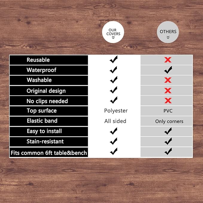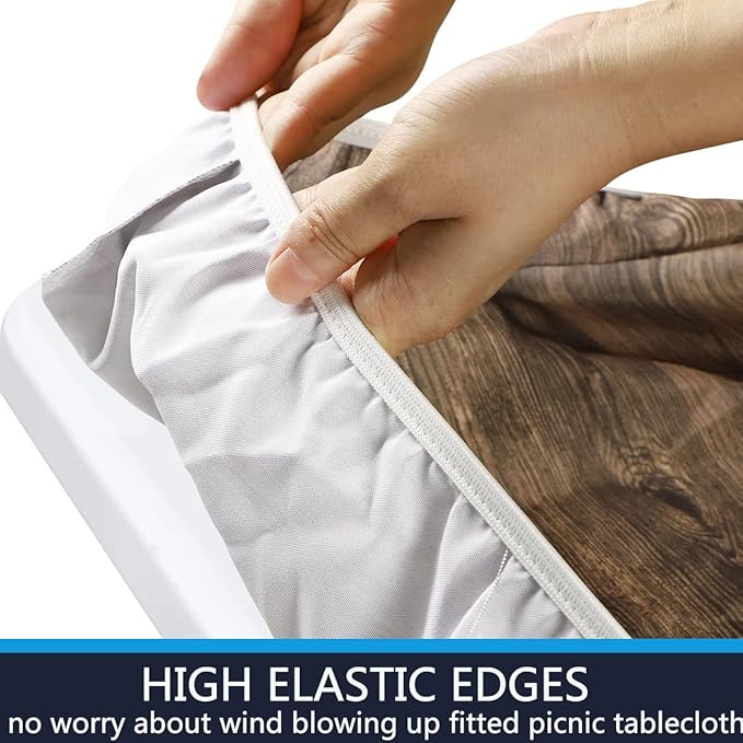 - 【Fitted Picnic Table Cover】-Our elastic picnic table covers are all stitched with four-sides high elastic band, easy to install and remove by one person; Fitted snug and perfectly suitable for mostly 6ft picnic tables; NO CLIPS NEEDED; When you enjoy the picnic outdoors, you don't have to worry about the strong wind blowing off the tablecloth and getting your food messy