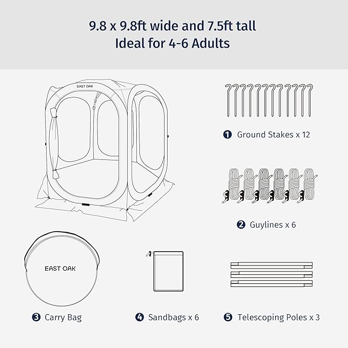 - š£š¼š½-šš½ š³š¼šæ šš®šš š¦š²š šš½ š®š»š± š¦šš¼šæš®š“š²: Suitable for 4-6 people, EAST OAK portable screen house features a convenient pop-up design that allows for easy installation by a single person in under one minute. The tent is designed to be easily folded and has a convenient carrying bag. Packed away in its included carry case, its dimensions measure a coimpact 30.7x3.9x30.7 inches