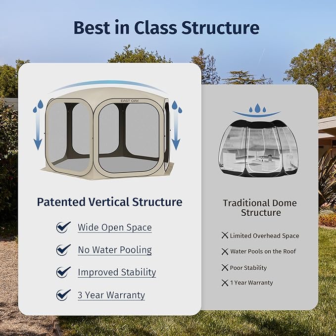 - ššš“-š£šæš¼š¼š³ & š©š²š»šš¶š¹š®šš²š±: The EAST OAK portable pop-up screen teent features a 4-sided B3 fine mesh design for 360° perfect ventilation to protect you from mosquitoes, bugs and anything the outdoors can throw at you. The tent body is made of high-quality Oxford fabric with anti-UV silver coating to achieve all-day UPF 50+ UV protection. Perfec for picnics, camping, and the beach