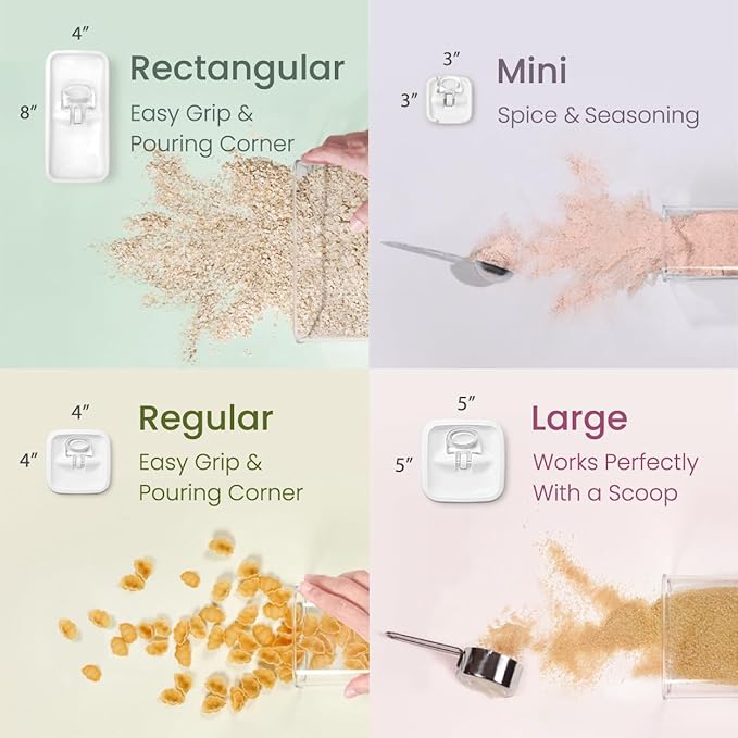 - AVAILABLE IN VARIOUS SIZES & SHAPES: The Felli Flip Tite container provides a wide variety of sizes and shapes, each designed to accommodate different types and amounts of food. The 4” REGULAR & RECTANGULAR sizes are ideal for small kitchen counter pantry organization, and their design ensures easy handling and pouring. The 5" LARGE size is perfect for storing powders that require scooping. Finally, the 6” XL size is specifically designed for bulk storage, making it versatile for various storage needs.