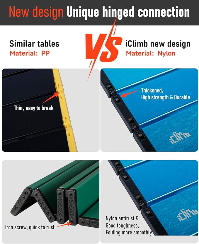 - Ultralight, made of aerospace-grade aluminum alloy, only 3 lbs; Max Load 66 lbs; Unlike wooden or nylon-top tables, this table is durable, waterproof, corrosion-resistant, easy to clean; Sturdy joints and connectors, plus anti-slip rubber feet make this table more stable, and the legs won't fold, bend, or disengage on different terrain