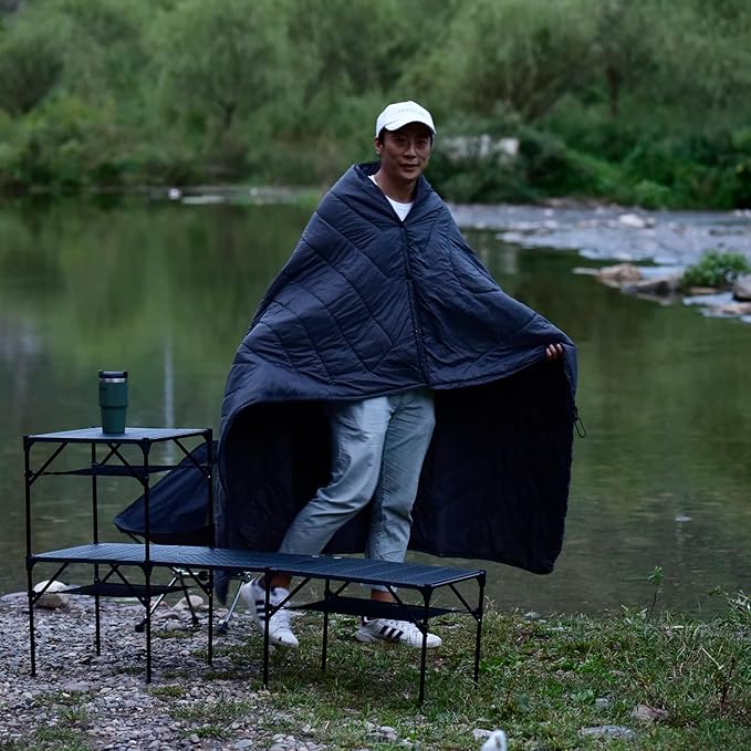 - Multifunctional. With the buttons and elastic straps, this blanket can be used as quilt, poncho, shawl, temporary sleeping bag. You can also put two blankets together and make it one two-person sleeping bag. Keeping you cozy while sitting around the fire or on your couch, lying in hammocks, reading books, tailgating, cooking meals. Perfect for camping, backpacking, hiking, mountaineering, traveling, lounging, picnics, beach trips, concert events, airplane trips, and other outdoor activities.