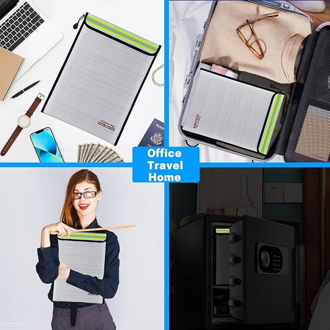 - 【apply to】 -- Fireproof bags for home, office, travel and emergency preparedness. There is enough space to store important documents, passports, licenses, USB disks, CD deeds, cash, letters, valuable photos, certificates, jewelry, laptops and other valuables.Nothing is completely foolproof, but added protection is always a good idea. It can also be used for safe storage of RC batteries, power banks, and mobile power supplies。Prevent the Lipo battery from catching fire and causing a bigger fire。